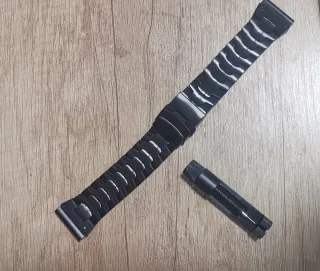 Preciosa correa de metal con un ancho de 26mm y sistema de acomple quickfit. Perfecta para relojes Garmin y otros, da un aspecto poderoso y masculino. Incluye herramienta de ajuste de eslabones. Sin estrenar. Venta en persona, no envío. - Diseño elegante y moderno. - Cierre de seguridad. - Material resistente.