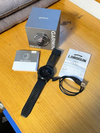 Reloj deportivo Garmin Fenix 5X Plus con lente de zafiro. - Caja original. - Manual de usuario. - Cable de carga USB. Con muy poco uso, está prácticamente nuevo, solo se usaba para ver la recepcion de mensajes, mails...
