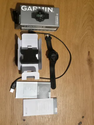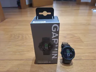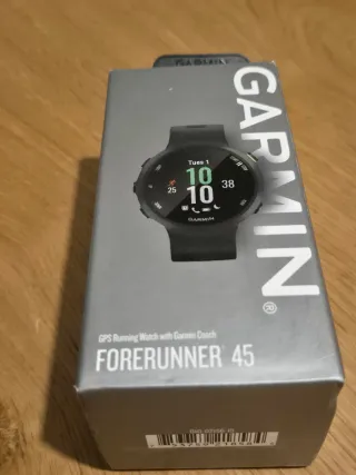 Se vende reloj deportivo Garmin Forerunner 45 en color negro. Está en perfecto estado y sirve para running, correr en cinta, bici, bici estática, caminar y se pueden añadir, manualmente, otros deportes. Además, dispone de GPS integrado, se conecta via Bluetooth con el móvil y aporta datos de sueño, descanso, etc. Cuenta con cargador incorporado, batería en perfecto estado y pantalla a color. Se vende con caja original y papeles.