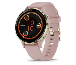 Elegante reloj inteligente Garmin Venu 3S, Smartwatch Premium con GPS, AMOLED, Funciones avanzadas de Salud y Forma física, más de 30 Aplicaciones Deportivas, 10 días de autonomía, Rosa Gold. - Caja y detalles en tono dorado. - Correa de silicona en color rosa. - Pantalla circular a color. -Caja Venu 3S Cable de carga/datos Documentación