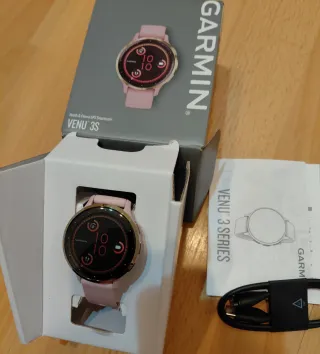 Reloj inteligente Garmin Venu 2S en color negro. Incluye caja y manuales. - Perfecto como monedero, puedes configurarlo para pagar y es muy práctico. - Puedes descargar música. - Te hace seguimiento de la calidad del sueño, actividades, pasos... - Puedes vincularlo para notificaciones. - Con la app haces seguimiento y puedes guardar los datos a largo plazo, yo tengo la app Connect. - Pantalla a color. - Correa ajustable. - Incluye manual de seguridad y producto. - Incluye guía de inicio rápido. Lo compré nuevo y lo he tenido hasta ahora.