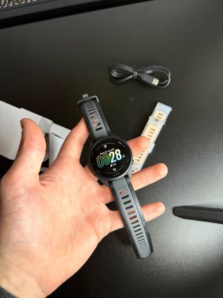 Reloj deportivo Garmin Forerunner 165 con GPS integrado. Diseño moderno y funcional. - Pantalla a color. - Correa de silicona. - Resistente al agua. No dispongo de la caja del producto. Sólo reloj y cable de carga.