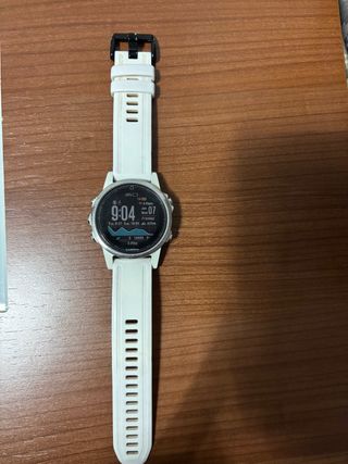 Reloj inteligente Garmin Fenix 5S con correa blanca y detalles plateados. - Diseño deportivo y elegante. - Correa de silicona cómoda. - Bisel plateado. Funciona perfectamente, está en buen estado y tiene protector de pantalla.