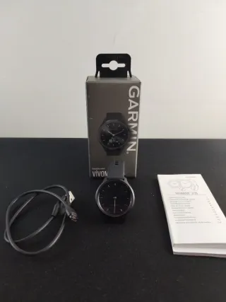 Reloj inteligente Garmin Vivomove 3 en color negro. Incluye su caja original y cable de carga. - Diseño elegante y moderno. - Correa de tela. - Pantalla híbrida.