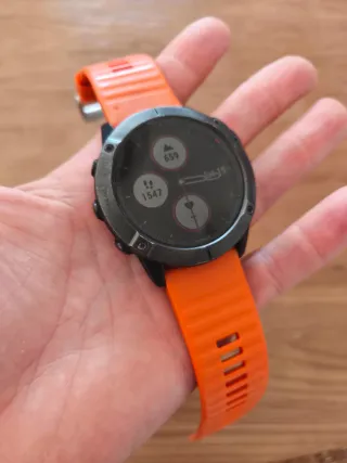 Reloj deportivo Garmin Fenix 6X con acabado Zafiro. - Correa de silicona naranja original Garmin. - Bisel de acero inoxidable. - Pantalla a color. Comprado por 800€ en perfecto estado