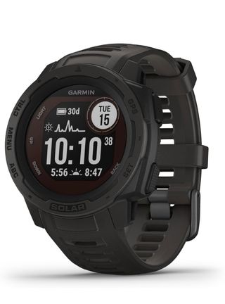 Reloj inteligente con GPS y carga solar. - Pantalla con información de actividad y batería. - Botones de control en el bisel. - Correa de silicona resistente. Garmin Instinct Solar, Reloj inteligente con GPS resistente al agua, Función de carga solar, Funciones deportivas, pulsioximetría y notificaciones del smartphone, Color Grafito 0/086781 no incluye cargador
