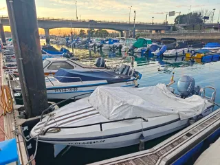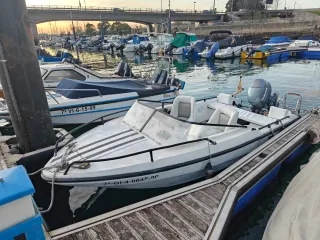 Se vende barco modelo Rio 450 Top. Eslora: 4,5 metros. Manga: 1,85 metros. Con motor fueraborda Yamaha 50CV 4 tiempos con reloj y power trim. Incluye colchonetas de proa y toldo de fondeo y bimini. Incluye GPS Garmin 421S. Con mesa desmontable. Con posibilidad de incluir el remolque: 8700€.