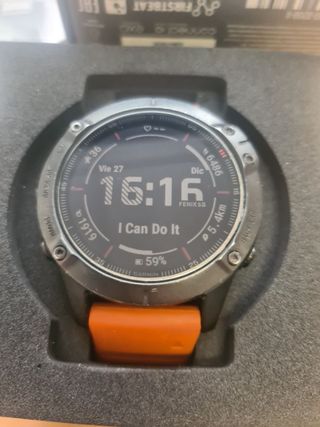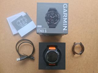 Garmin Fenix 6 Sapphire en su caja con correa naranja y otra de cuero negro. Lleva cristal templado y funda silicona. Funciona perfectamente. Venta en persona, no envío. No negociable