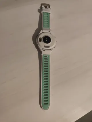 Reloj inteligente Garmin Vivoactive 4s. - Color de la caja: plateado. - Esa correa que aparece en la imagen no es la original, la original se la pondría al enviarlo, pues no la he usado nunca para conservarla en perfecto estado. - El reloj funciona al 100% en todas sus funcionalidades. - No tiene daños ni desperfectos. - La batería le dura 3 / 4 días haciendo actividad física, y 6 / 7 días sin hacer actividad física. Tiene mucha durabilidad, incluso estándo siempre conectado al móvil. - Tiene una caja / carcasa de tamaño ideal porque no es muy grande. Perfecto para diario.