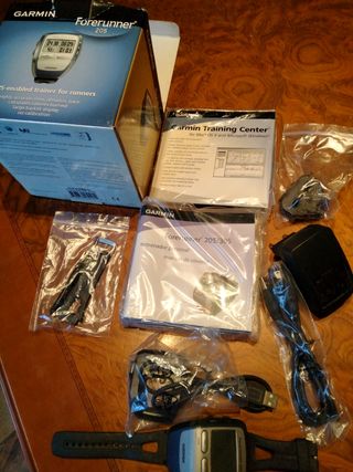 Accesorios Garmin Forerunner 205. Caja con manuales, cargador de pared, cable de ordenador y pulsera de recambio. Regalo el reloj que carga pero no aguanta mucho.