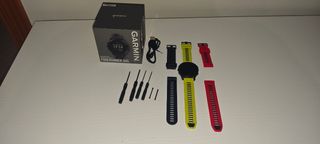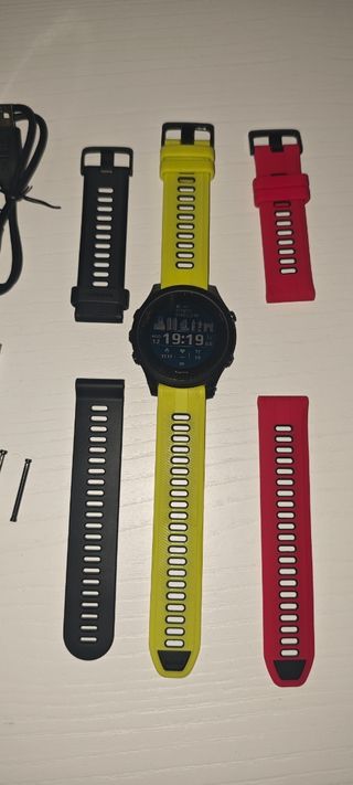 Vendo mi Garmin Forerunner 945, un reloj GPS en excelentes condiciones. Incluye correas adicionales en amarillo y rojo, además de una negra. EL ENGANCHE CON LA PULSERA SE ROMPIÓ Y ESTÁ PEGADO CON COLA. Se puede ver en las imagenes. Garmin no se ha querido hacer cargo. Está en perfecto estado. Menos de 300 días utilizado. Vendo por cambiar de marca. Ya no vuelvo más a GARMIN. Bye bye. - Tres correas intercambiables. - Está en perfecto estado. - Incluye cable de carga.
