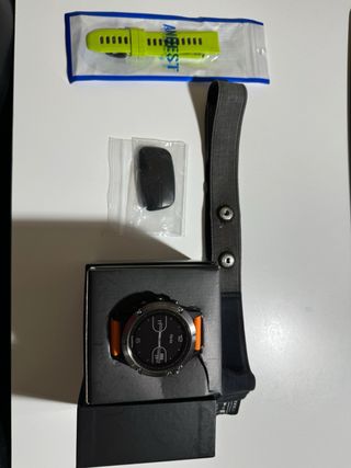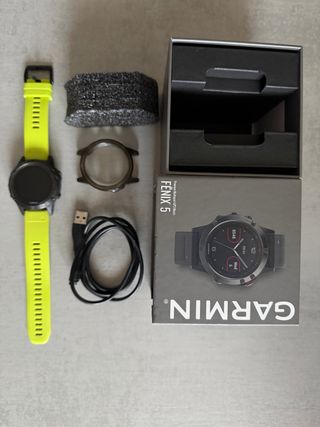 Reloj inteligente Garmin Fenix 5 con correa amarilla y bisel negro - Incluye caja original. - Cable de carga USB. - Aro protector. - Cristal protector desde el primer dia. Reloj muy cuidado, no se ha utilizado en la playa. vendo por cambio a modelo superior. No se envia. trato en mano.