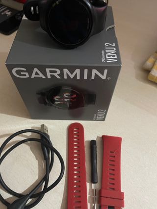Reloj inteligente Garmin con un diseño deportivo y robusto. - Correa de silicona en color rojo. - Bisel en color negro. - Pantalla con tecnología Solar para carga adicional. -Estado impecable (muy poco uso). -Entrego caja y accesorios originales.