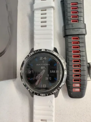 Vendo Garmin Fénix 6S Pro Estado: • Funciona perfectamente. • Batería en buen estado • Pantalla en buen estado. • El bisel presenta arañazos y marcas de uso visibles en las fotos pero casi imperceptibles a simple vista. • Correa original Garmin negra, desgastada. • Incluye caja original. • Incluye correas blanc y roja mas una correa negra de piel. No dispone de cargador Se vende por cambio de modelo Precio ajustado al mercado y al estado estético. 📦 Entrega en mano o envío por Wallapop 💬 Atiendo dudas sin compromiso.