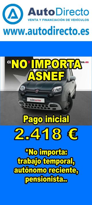 ¿No consigues financiación? ¡Tenemos la solución! RENT CREDIT (Alquiler con opción a compra) *************************************************************************** ✅ Aprobamos más del 95% de las operaciones. ✅ No importa ASNEF o RAI, impagos pendientes, ser autónomo o empresa reciente, ser pensionista. ✅ Imprescindible aportación inicial del 20%. ✅ Ejemplo de operación: FIAT PANDA 1.0 HYBRID 70CV GARMIN. Ref. W953033MHK - Precio vehículo: 12090 €. - Aportación inicial de 2418 €. - Cuota mes desde 256 €. ✅ Impuesto de circulación y garantía de 1 año incluidos. *************************************************************************** ✅ Más de 3.000 VEHÍCULOS EN STOCK. ✅ Kilómetros certificados. ✅ 17 concesionarios repartidos en toda España. ♻️ Aceptamos tu coche como parte de la operación. *************************************************************************** IMPORTANTE: -. Este anuncio, no es vinculante, puede contener errores. SE MUESTRAN A TÍTULO INFORMATIVO Y NO CONTRACTUAL. -. Consultar disponibilidad del vehículo y datos exactos: fecha de matriculación, importes, etc,... *************************************************************************** Te ofrecemos distintas opciones: Venta al contado, financiación, renting, RENT CREDIT (Alquiler con opción a compra).