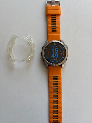 Reloj inteligente Garmin Fenix 8 de 51mm con correa naranja y bisel plateado. - Pantalla a color. - Incluye protector de pantalla transparente. -Incluye caja y cable de carga - Todavia en garantia. Comprado en el corte ingles en Julio de 2025.