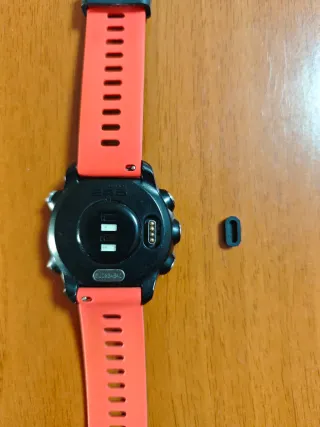 Reloj deportivo Garmin Forerunner 225 en color negro y rojo. En muy buen estado, poco uso. Funciona perfectamente. - Incluye cable de carga USB y juego completo de correa de sustitución con destornilladores para su montaje. - Caja original del producto.