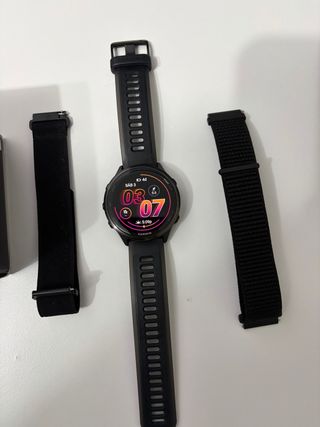 Reloj deportivo Garmin Forerunner 570 en color negro. Incluye dos correas adicionales. - Correa principal de silicona negra. - Correa adicional de tela negra con cierre de velcro. - Correa adicional de tela negra con cierre de velcro. Rasguño visible en la foto