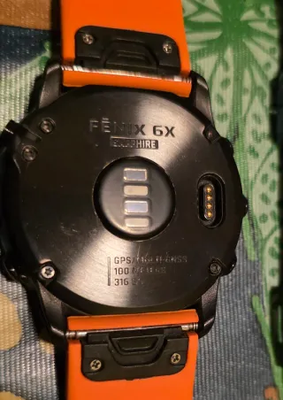 Reloj deportivo Garmin Fenix 6X Sapphire con acabado DLC. 51mm - Correa de silicona naranja y negra nueva - cristal de zafiro. Sin ninguna marca - bisel dlc con alguna marca de uso - software actualizado y mapas actualizados - conector de carga en perfectas condiciones - Bateria dura mas de 17 días sin uso gps, sin apagarlo y conectado siempre al movil - incluyo cable de carga. -caja original modelo joyería Se puede hacer entrega en mano en Madrid.