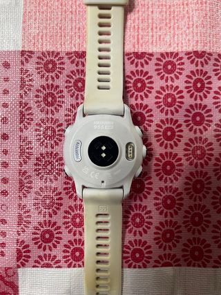 Reloj inteligente Garmin Forerunner 955 Solar en color blanco. - Pantalla táctil y GPS. - Carga solar para mayor autonomía. - Monitorización de actividad física. Hay una raya pequeña en la pantalla. Sin cable de carga y cargador. Precio negociable.