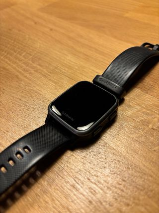 Reloj inteligente Garmin Venu en color gris y plateado. El agarre silicona se ha roto