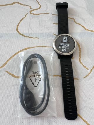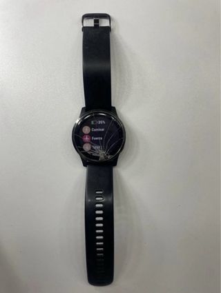Smartwatch de la marca Garmin en color negro. - Diseño elegante y moderno. - Correa ajustable. Tiene la pantalla rota, pero funciona correctamente. Incluye caja e instrucciones. No incluye cargador.