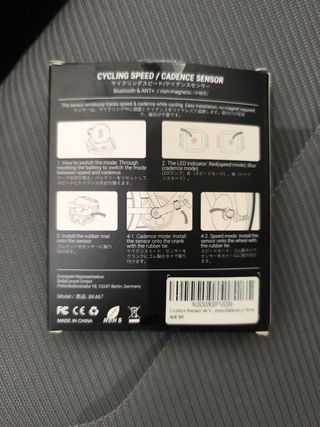 En muy buen estado. Casi a estrenar. Sensor de velocidad/cadencia para ciclismo Coospo BK467. Es un sensor dual que puede medir la velocidad o la cadencia en tiempo real. Utiliza tecnología Bluetooth y ANT+ para transmitir datos a ciclocomputadores o aplicaciones de ciclismo compatibles (como Wahoo, Zwift y Garmin). Para cambiar entre el modo de velocidad y cadencia, simplemente se quita y vuelve a poner la pila de botón CR2032. Es resistente al agua con clasificación IP67, lo que lo hace adecuado para su uso en condiciones de lluvia. Ligero y fácil de instalar.