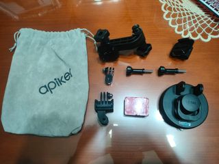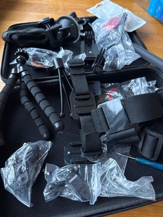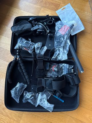 Kit de accesorios para cámaras GoPro, ideal para capturar tus aventuras. - Incluye trípode pequeño. - Soporte con ventosa. - Arnés para pecho. - Palo selfie. - Diversos soportes y adaptadores.