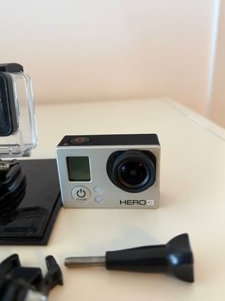 Cámara de acción GoPro Hero 3 en color plateado y negro. Incluye accesorios. - Carcasa protectora transparente. - Soporte para cámara. - Accesorio de montaje. - Tapa de repuesto.