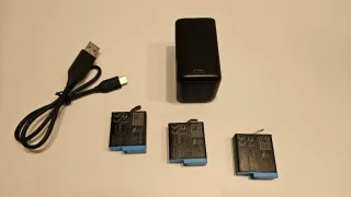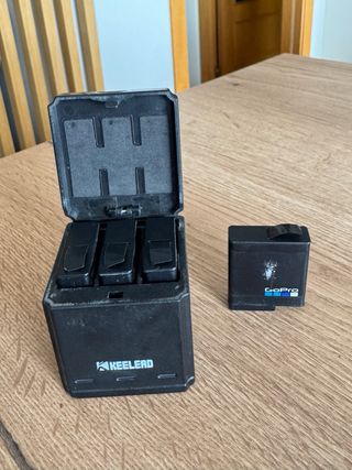 Pack de cargador triple y 4 baterías para cámaras GoPro. El cargador es de la marca Keelead y las baterías son 1 de GoPro y 3 de keelead. Funciona todo perfectamente y las baterias no estan dañadas. - Cargador triple para baterías GoPro. - Incluye 3 baterías GoPro. - Color negro.