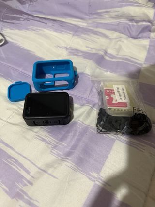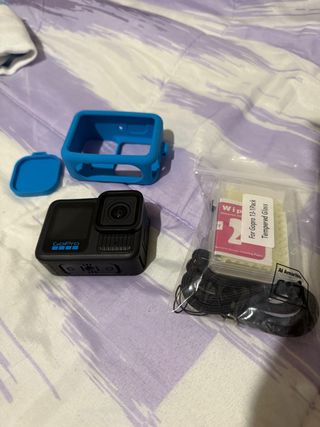 Cámara de acción GoPro Hero 13 Black en color negro, con accesorios. - Carcasa protectora azul. - Tapa de lente azul. - Correa de sujeción. - Kit de cristal templado y limpieza con toallitas y paño. Se vende por que no la doy uso tiene 3 rajas en la pantalla de una caida pero funciona perfectamente escucho ofertas