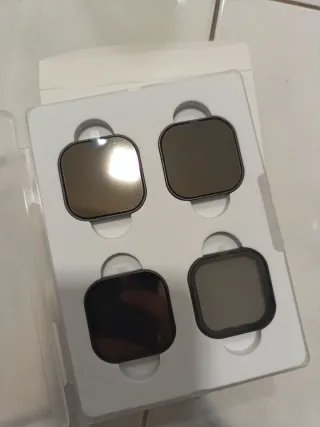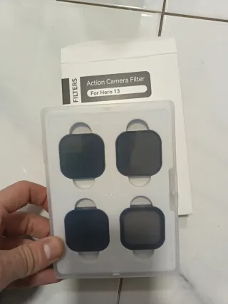 Set de filtros para cámaras de acción GoPro Hero 13. Incluye cuatro filtros en un estuche protector. - Diseñados para GoPro Hero 13. - Estuche de plástico transparente para almacenamiento. - Cuatro filtros cuadrados incluidos.