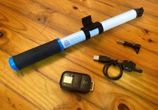 Se vende un kit compuesto por mando a distancia GoPro (compatible con Hero 3 4 5 6 7 y 8) y palo extensible GoPole Reach 2.0 (entre 36 y 102cm). Incluye además tornillo de montura, soporte de mando, cable de carga y llave de mando. No se incluye las cámaras mostradas a modo de comprobación del funcionamiento. - Extensor GoPole Reach con empuñadura. - Mando WiFi GoPro con cable USB.