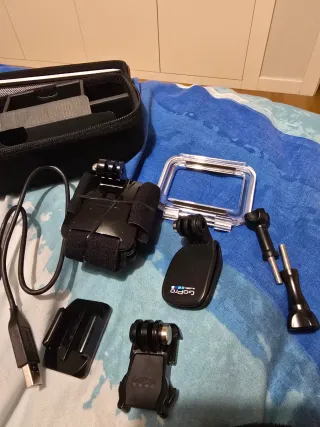 Neceser original para GoPro Hero 11 Black, incluye varios accesorios. - Neceser de transporte. - Soporte de muñeca. - Carcasa acuática. - Soporte adhesivo. - Soporte clip. - Cable de carga USB. Vendo por haber perdido la GoPro