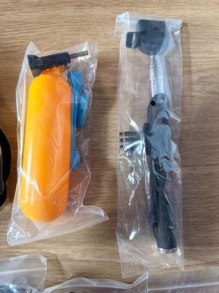 Kit de accesorios para cámaras GoPro. - Soporte de pecho y cabeza - Bomba de inflado. - Extensor. - Adhesivos 3M VHB. - Soporte giratorio. - Adaptadores.