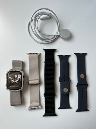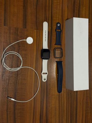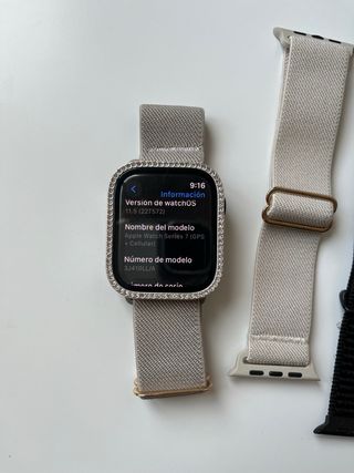 Reloj inteligente Apple Watch Series 7 con conectividad GPS y LTE. Incluye cargador y correas. - Caja de aluminio en color azul marino. - Correa deportiva blanca. - Correa deportiva azul marino adicional. - Protector de pantalla transparente. La caja original de este en concreto no la tengo, no la he encontrado, pero puedo entregar con el reloj la que muestro en pantalla que es de otro apple watch que tuve. Ademas de las de la imagen tengo varias correas que entrego también. Lo vendo porque mehe comprado otro reloj cuya autonomía de la barbería es mayor.