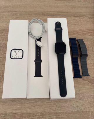 Este Apple Watch Series 7 enazul marino es un accesorio elegante y funcional. Lo vendo porque lo compre y solo lo he utilizado 2 veces contadas porque estos relojes inteligentes no son para mi. - Incluye cargador magnético. -Regalo las cuatro correas: una de tejido gris claro, una negra de tejido, y dos de silicona azul marino. También la carcasa protectora del apple watch !! Precio negociable!!
