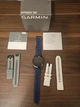 Gran oportunidad! Reloj GPS Garmin Approach S60 para golf. Incluye correas adicionales. - Color de la caja: Negro - Color de la correa principal: Azul marino - Color de las correas adicionales: Gris y blanco
