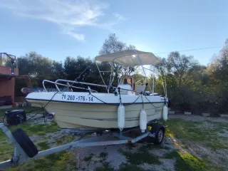 Barco a motor con remolque a bascula con motor elec para subir el barco sin esfuerzo año 2014 Eslora 480 Motor 40 caballos evinrude Motor de socorro 2,5 mariner 2 plataforma de teka trasera y escalera Toldo, defensa lateral Se vende con las EPI para tripulación GPS , walkie talkie deal para disfrutar del mar o ir a pescar