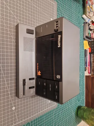 Grabadora de datos Philips NMS 1515 en color gris y negro. - Sen han cambiado los tres engranajes internos que se suelen deshacer por unos nuevos de buena calidad. - Diseño compacto. - Controles de fase y señal de salida. Funciona todo correctamente excepto la tecla de pausa, que no se queda enclavada y la tecla de revobinado salta a los 3s aprox. de ser accionada. Funciona con un adaptador de corriente de 9V DC, no incluído, con el negativo en el centro. Se trata de una grabadora de datos (data recorder) diseñada específicamente para la serie de ordenadores MSX.