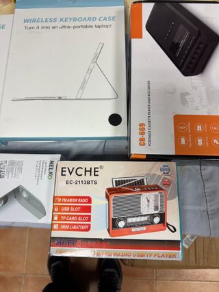 Lote de varios artículos electrónicos. - Radio portátil FM/AM/SW con ranura USB y TF Card. - Reproductor y grabador de cassette portátil. - Funda con teclado inalámbrico para portátil.