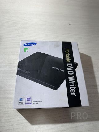 Grabadora de DVD portátil externa Samsung SE-208. Es una unidad externa delgada y compacta. Se conecta y alimenta mediante conexión USB (requiere dos puertos). Compatible con sistemas operativos Windows y Mac OS. Soporta una variedad de formatos de DVD y CD, incluyendo DVD+/-R a 8X y CD-R a 24X.