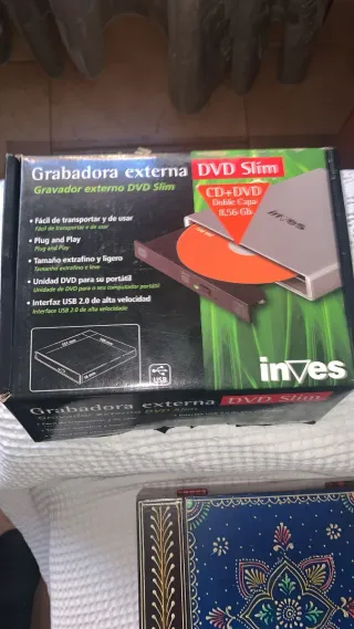 Grabadora externa de DVD Slim de la marca Inves. Es fácil de transportar y usar. - Plug and Play - Tamaño extrafino y ligero - Interfaz USB 2.0 de alta velocidad - Doble Capa CD+DVD 8,56 Gb