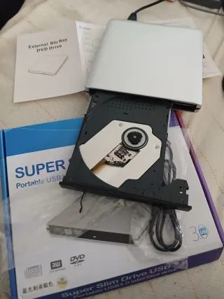 Lector grabadora de CD/DVD externa para portátil, ideal para copias de seguridad o instalación de software. - Formato ReWritable (RW). - Alta velocidad de lectura/escritura. Pequeña marca en la carcasa de plástico exterior que se muestra en las últimas fotos. No afecta al funcionamiento