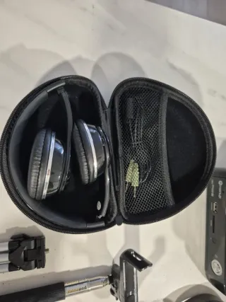 Conjunto de accesorios tecnológicos. - Auriculares negros Jabra (hay que cambiarles las almohadillas) - Auriculares inhalambricos con funda de transporte. - Palo selfie extensible. - Grabadora USB mini - Memoria externa para audiovisuales, con mando. - Otros