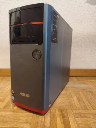 Torre de ordenador ASUS modelo M32CD-SP006T con procesador Intel Core i5-6400. Diseño moderno en color gris con detalles en rojo. Con tarjeta gráfica ASUS GTX 550 TI. RAM de 8GB. - Puertos frontales: USB, audio, lector de tarjetas. - Botón de encendido circular. - Logos de AMD, HDMI y Microsoft Windows visibles. - Wifi, Bluetooth y grabadora de DVD. - Sin disco duro. Venta en persona.