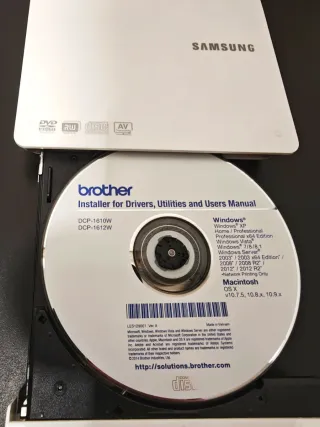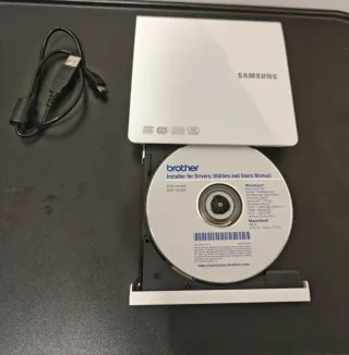 Grabadora de DVD externa delgada de la marca Samsung. Incluye cable USB y un disco de instalación de Brother. - Diseño compacto y ligero. - Conexión USB para fácil instalación. - Incluye disco de instalación para Drivers, Utilidades y Manual de Usuario de Brother DCP-1610W/DCP-1612W. ¡¡En mi perfil encontrarás otros objetos en venta!!
