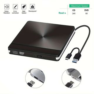 Esto es nuevo, nunca usado. ***No funciona con Chromebook ni TV, automóvil, teléfono inteligente.*** Esta unidad de CD/DVD externa portátil con conector USB 3.0 y USB-C 2 en 1 le permite usarla en la mayoría de las computadoras portátiles/estacionarias sin necesidad de un conector o centro. Simplemente conéctelo a un puerto USB 3.0, 2.0 o USB-C, y su compañero lo reconocerá automáticamente, luego podrá reproducir sus CD o DVD usando el software apropiado. Velocidad de lectura: CD-ROM: 24x Máx.; DVD-ROM: 8x máx.; DVD-ROM (DL): 6x máximo Velocidad de escritura: 24x CD-R, 8x CD-RW, DVD ± R: 8X máx.; DVD ± R DL: 4X máx.