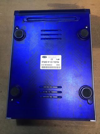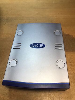 Grabadora de DVD externa LaCie con conexión Firewire. Diseño plateado con detalles en azul. Funciona perfectamente en mi Macintosh G3