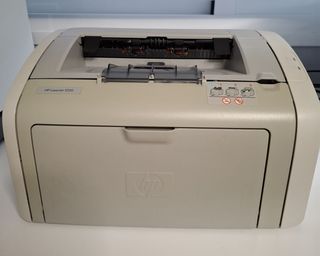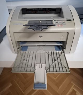 Impresora HP LaserJet 1020 en color beige y gris. Se atasca de vez en cuando el papel. Lo ideal sería limpiarla y solucionar lo del papel, algo fácil para alguien que sepa. El toner está casi sin uso. Tecnología: Láser monocromático (solo blanco y negro). Velocidad: Hasta 14-15 páginas por minuto (ppm). Calidad de impresión: Resolución de hasta 1200 ppp (con REt y FastRes). Soporta papel normal, sobres, transparencias, cartulina, postales, etiquetas. Dúplex (doble cara): Manual (mediante controlador). Conectividad: Puerto Hi-Speed USB 2.0.